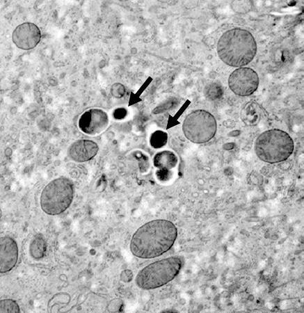 【写真】 マウスの肝臓に取り込まれた特定のタイプのミュータンス菌(矢印)(大阪大提供) (2012/03/26)